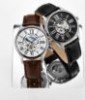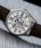 Men’s Automatic Silver Case, Silver Polished Bezel, White And Silver Skeletonized Dial With Gold Toned and Red Accents, Blue Hands, Black Markers, Brown Alligator Embossed Genuine Leather Strap Watch