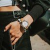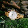 Emma Olive Frost, iridescent white mother-of-pearl dial accented with white diamond numerals. Minimalist design framed gracefully in patterned olive wood case and band. All mother-of-pearl dials are unique pieces, full of mystery and surprises in different lights.