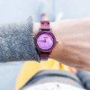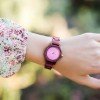 The Pearl Petite Purple Heart features an iridescent purple mother of pearl dial detailed with white diamonds as numbers, framed with an elegantly minimal case and band made from all natural purple heart wood.