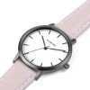 On an elegant 16mm wide edge stitched leather strap in soft pink, the gunmetal case and white dial make for a powerful, contrasting wristwatch.
