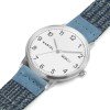 This model uses a stainless steel case with white dial on a blue check pattern merino strap. The date window shows the day of the week and date.