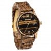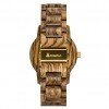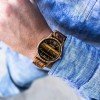 The Odyssey Tiger Eye Zebrawood men's watch is made of natural zebrawood. The dial, which includes a date indicator, is cut from tiger eye stone and detailed with gold markings and Roman numerals at 6 and 12 o'clock.