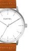 This KT-HUME 40mm-SWFT model watch features a combination of 40mm silver case with white dial on a flat tan leather strap.