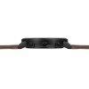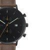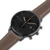This model features our best-selling all-black colour scheme with a black case and dial featuring luminous hour and minute hands and an orange second hand, on a brown stitched leather strap. The dial features dual sub-dials, displaying seconds and minutes with contrasting orange hands, and a simple date window showing the date.