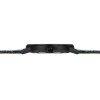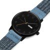 This model uses an all black head, with an orange second hand, on a blue & grey check pattern merino/cashmere blend strap. The date window shows the day of the week and date.