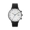 This model features a gunmetal case and white dial featuring luminous hour and minute hands and pale blue second hand, on a black flat leather strap. The dial features dual sub-dials, displaying seconds and minutes, and a simple date window showing the date.
