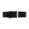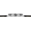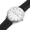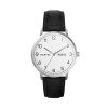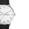 This model uses a stainles steel case with white dial on a stitched black leather strap. The date window shows the day of the week and date.