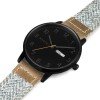 This model uses our best-selling all black watch head, with an orange second hand, on a pale grey herringbone pattern lambswool strap with tan leather end pieces. The date window shows the day of the week and date.