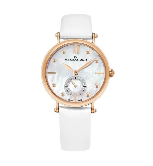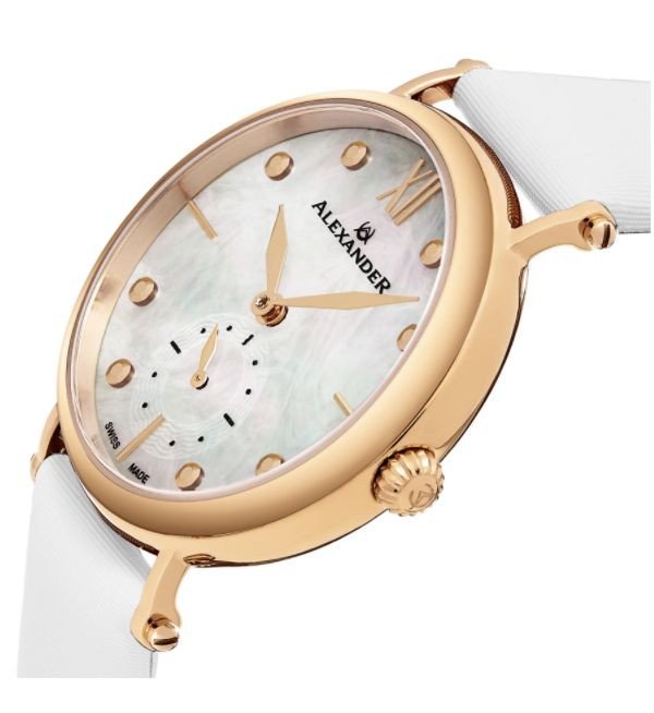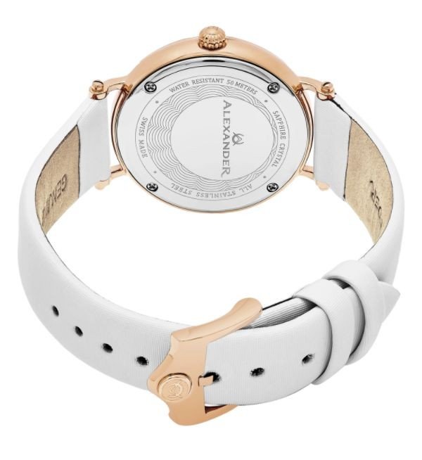 The Roxana is available in either a diamond-accented style or unadorned. The entire case features highly polished 316L stainless steel (also available in rose gold and yellow gold plated varieties). The easy-grip tapered crown is fluted with an engraved Alexander logo.
