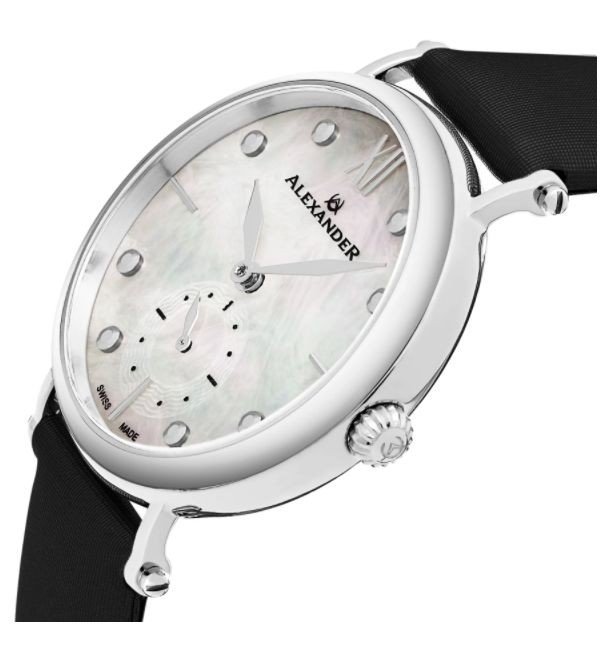 The Roxana is available in either a diamond-accented style or unadorned. The entire case features highly polished 316L stainless steel (also available in rose gold and yellow gold plated varieties). The easy-grip tapered crown is fluted with an engraved Alexander logo.