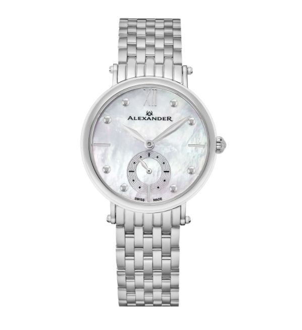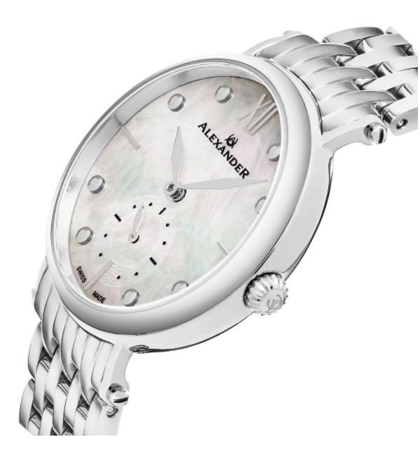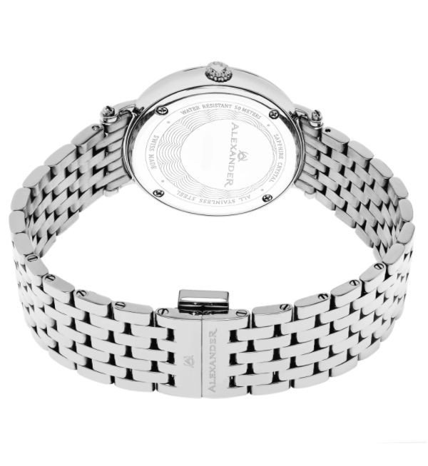 The Roxana is available in either a diamond-accented style or unadorned. The entire case features highly polished 316L stainless steel (also available in rose gold and yellow gold plated varieties). The easy-grip tapered crown is fluted with an engraved Alexander logo.