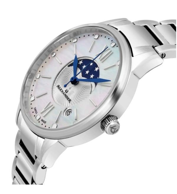 The Vassilis is available in either a diamond-accented style or unadorned. The entire case features highly polished 316L stainless steel (also available in rose gold and yellow gold plated varieties, and a two-tone yellow gold and steel version). The easy-grip crown is fluted with an engraved Alexander logo.