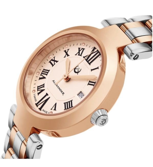 The Niki is a slim (8 mm thick) Swiss-made three-hand timepiece from Alexander's Monarch collection. It features a combination of polished and satin brushed surfaces, in particular a beautifully finished caseband (side of case) with horizontal satin finish. The round bezel is finished in high-polish. The trapezoidal fluted crown offers generous dimensions for easy grip and features the Alexander logo in relief on a brushed background. The caseback is brushed and polished with four distinctive recessed screw-points for a beautifully balanced look. The center of the caseback features the Alexander logo with its graceful arrow-moon motif, together with Swiss Made engraving.