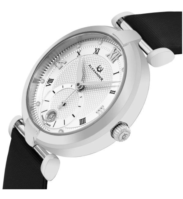 The Olympias is available in either a diamond-accented style or unadorned. The entire case features highly polished 316L stainless steel (also available in rose gold and yellow gold plated varieties). The onion-shaped crown is fluted with an engraved Alexander logo.