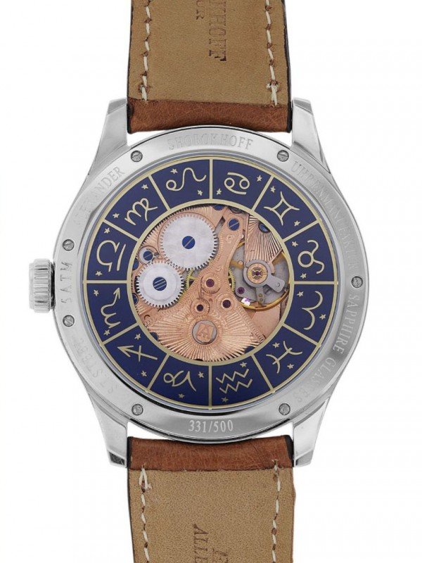 sapphire glass case back with view on the refined watch movement, fastened with 7 screws