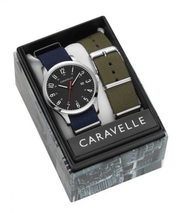 Designed by Bulova. Timeless design meets versatile style. Three-hand date feature and easy-to-read numerals with bold 24-hour design on matte black dial. Stainless steel case and two interchangeable NATO straps in navy blue and olive green. Case Diameter: 40mm Case Thickness: 9.1mm Water Resistance: 30M 3-Year Limited Warranty