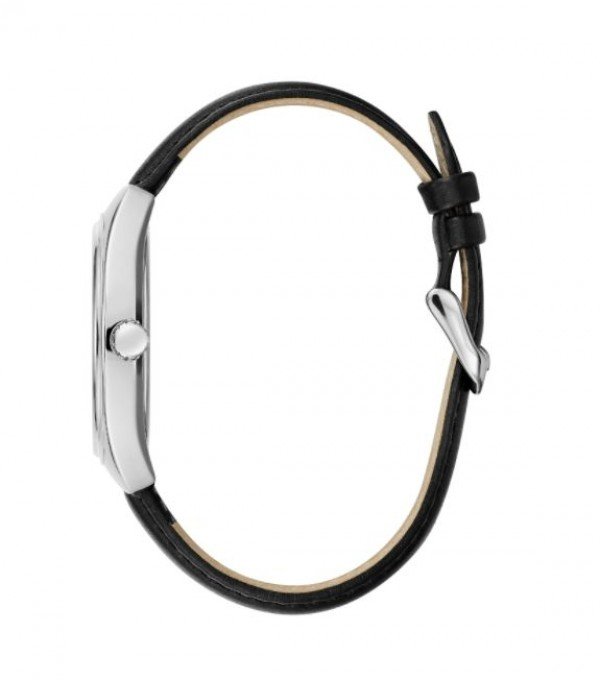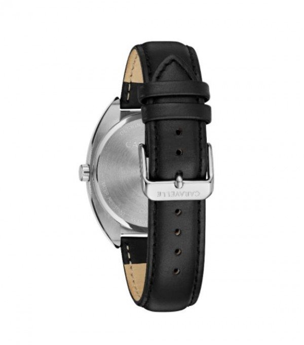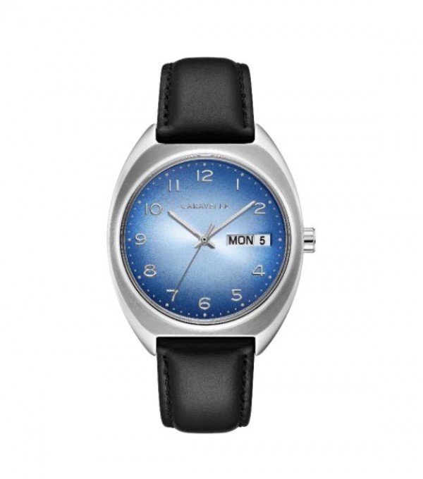Designed by Bulova. Retro-style, modern attitude! Dark blue degrade dial with day/date feature and saddle-shaped stainless steel case with black leather strap with buckle closure. * Case Diameter: 40mm * Case Thickness: 10mm * Water Resistance: 50M * 3-Year Limited Warranty