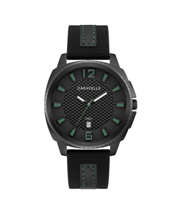 Designed by Bulova. Go tough on style. Bold black multilayered dial with a carbon-fiber weave pattern on inner core sets off raised dimensional hour markers outlined in green and a date feature at 6 o'clock. Cushion shaped black IP stainless steel case, and black nylon/leather strap green-stitched accents and wire buckle closure. * Case Diameter: 41mm * Case Thickness: 10mm * Water Resistance: 50M * 3-Year Limited Warranty