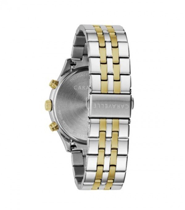 Refined styling with six-hand chronograph function and matte black dial. Gold-tone accents on stainless steel case and bracelet with fold-over buckle closure.