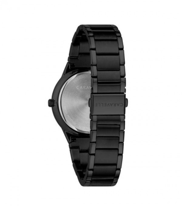Sleek and polished, with single diamond at 12 o'clock and minimalist-design hour markers on matte black dial. Black IP stainless steel case and bracelet with double-press fold-over closure.