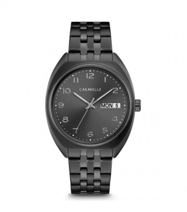 Designed by Bulova. Retro-style, modern attitude! Gunmetal dial with three-hand day/date feature and saddle-shaped gun IP stainless steel case and bracelet with double-push fold-over closure. * Case Diameter: 40mm * Case Thickness: 10mm * Water Resistance: 50M * 3-Year Limited Warranty
