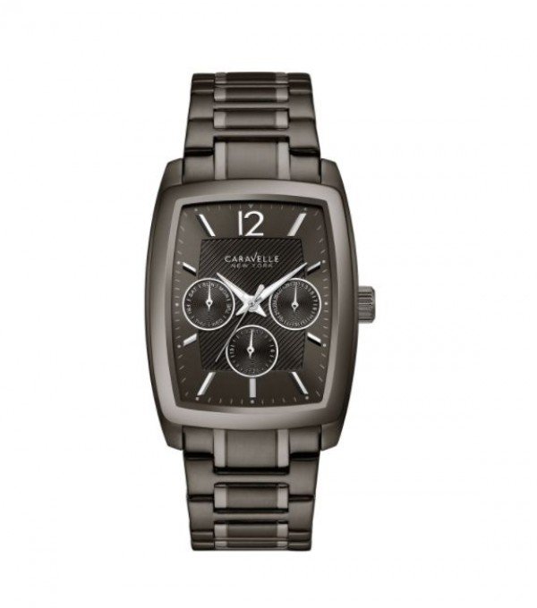 The new shape of classic style. Caravelle NY Men's Gunmetal dial with multifunction day, date and 24-hour subdials, Gunmetal IP stainless steel case and bracelet with double-press fold-over closure and water resistant up to 30 meters.