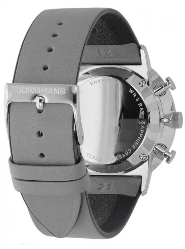 FEATURES : Made in Germany men's chronograph with quartz movement J645.85 date display stopwatch with 1/1 second increments and display of 30 stop minutes and 12 stop hours small second display matt dark grey dial with deepened minute markings concave indicators delicate bar indices and Arabic numerals polished luminous hands with Super-LumiNova polished stainless steel case case back fixed with 4 screws fluted crown with logo scratch-resistant, anti-reflective sapphire crystal grey calf leather strap with black lining leather stainless steel pin buckle with engraved Junghans lettering water resistant to 5 bar diameter 40 mm height 10.5 mm weight 59 g in a high-quality Junghans watch box