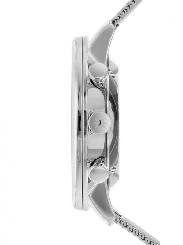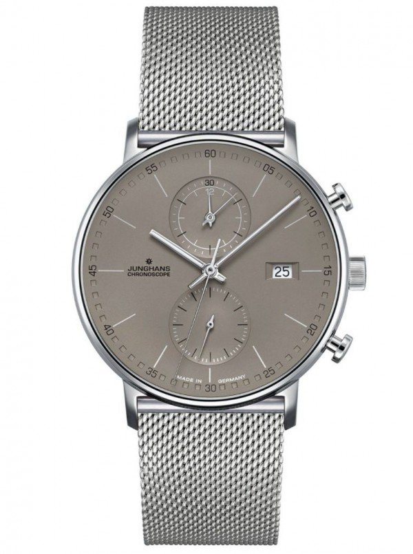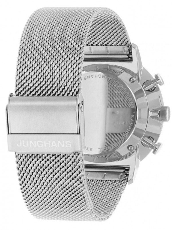 FEATURES : Made in Germany polished stainless steel case case back attached with 4 srews fluted crown with logo scratch-resistant, anti-reflective sapphire crystal flat stainless steel mesh band length adjustable clip clasp with safety latch battery-powered quartz movement J645.85 date stop watch in 1/1 seconds with 30 stop-minutes and 12 stop-hours small second three-dimensional matt taupe dial with concave subdials Arabic numbers polished luminescent hands water resistant to 5 bar diameter 40 mm height 10.5 mm weight 90 g in a high-quality Junghans watch box