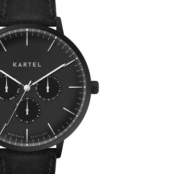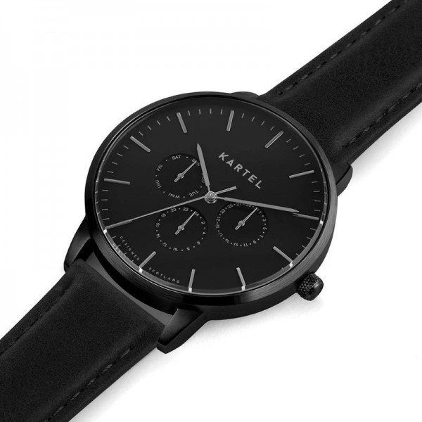 The new Cuillin calendar watch is a premium addition to the Kartel range. A large 43mm black stainless steel case features a black dial with 3 two-layer sub dials tracking the day, date and 24 hour position, beneath toughened low profile mineral glass.