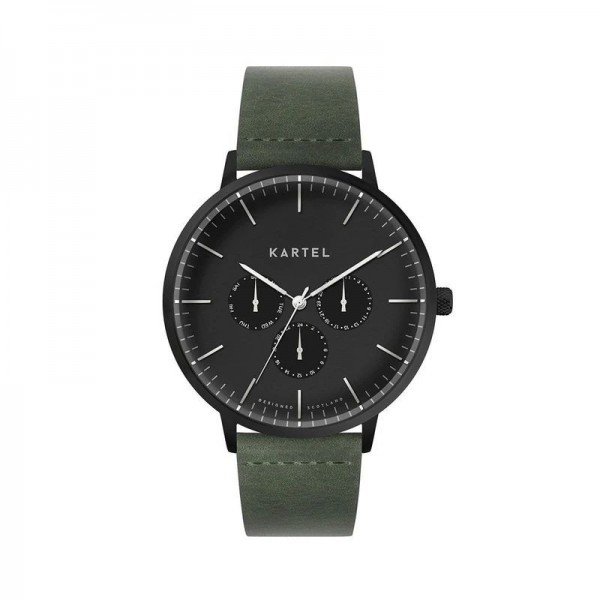 The new Cuillin calendar watch is a premium addition to the Kartel range. A large 43mm case features a black dial with 3 two-layer sub dials tracking the day, date and 24 hour position, beneath toughened low profile mineral glass.