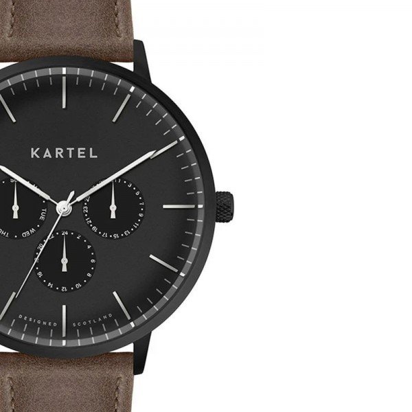 The new Cuillin calendar watch is a premium addition to the Kartel range. A large 43mm black stainless steel case features a black dial with 3 two-layer sub dials tracking the day, date and 24 hour position, beneath toughened low profile mineral glass.