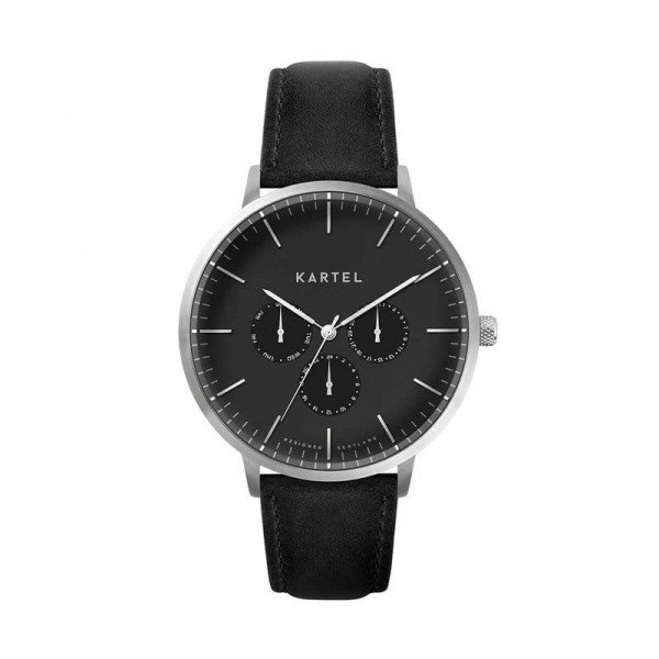 The new Cuillin calendar watch is a premium addition to the Kartel range. A large 43mm case features a black dial with 3 two-layer sub dials tracking the day, date and 24 hour position, beneath toughened low profile mineral glass.