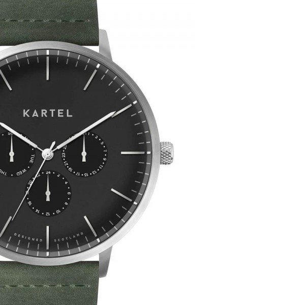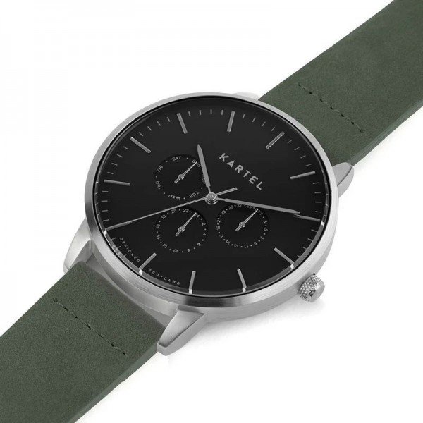 The new Cuillin calendar watch is a premium addition to the Kartel range. A large 43mm stainless steel case features a black dial with 3 two-layer sub dials tracking the day, date and 24 hour position, beneath toughened low profile mineral glass.