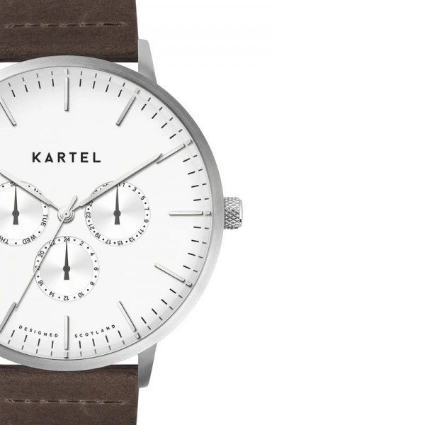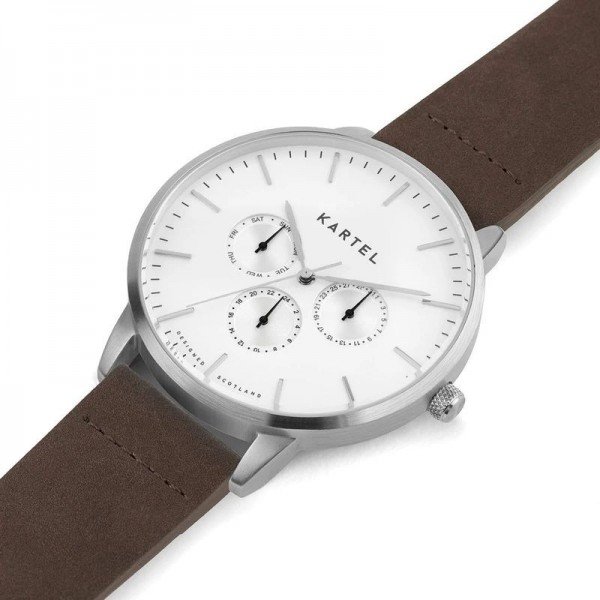 The new Cuillin calendar watch is a premium addition to the Kartel range. A large 43mm stainless steel case features a white dial with 3 two-layer sub dials tracking the day, date and 24 hour position, beneath toughened low profile mineral glass.