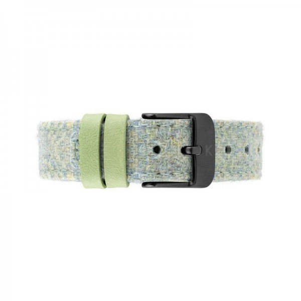A brushed gunmetal case with white dial sits on an elegant 16mm width strap featuring a pale green 'Ailsa' lambswool strap.