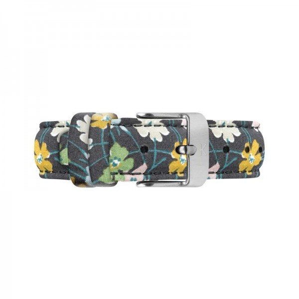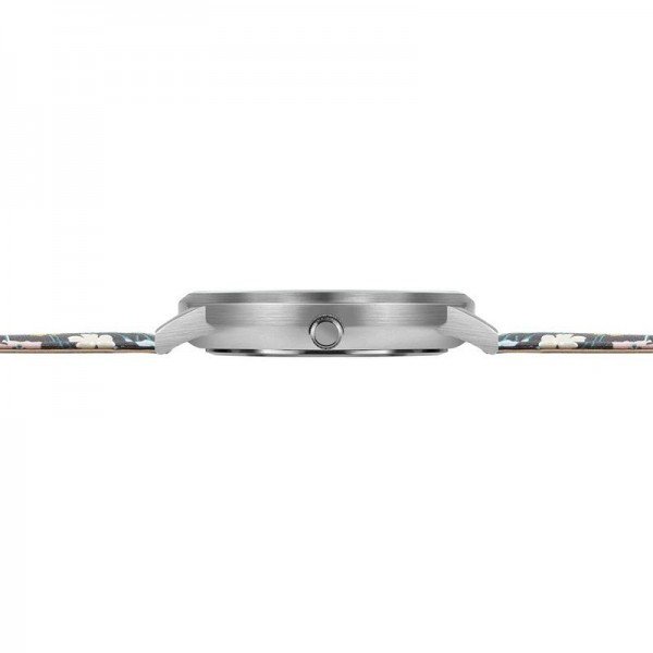 A brushed silver case with white dial sits on an elegant 16mm width Liberty of London 'Buttercup' poplin strap. The timeless dial design sits behind toughened low profile glass employing a Citizen Mitoya movement for reliability and accuracy.