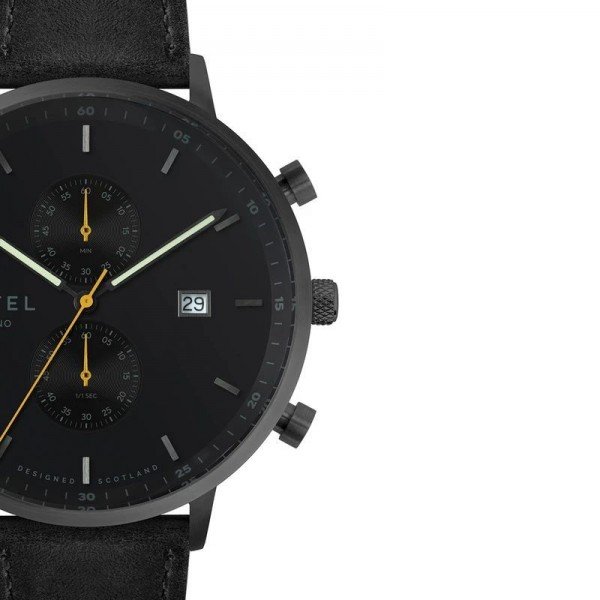 This model features our best-selling all-black colour scheme with a black case and dial featuring luminous hour and minute hands and an orange second hand, on a black stitched leather strap. The dial features dual sub-dials, displaying seconds and minutes with contrasting orange hands, and a simple date window showing the date.