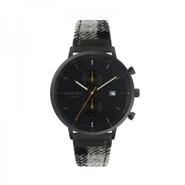 This model features our best-selling all-black colour scheme with a black case and dial featuring luminous hour and minute hands and an orange second hand, on a black & grey tartan design lambswool strap. The dial features dual sub-dials, displaying seconds and minutes with contrasting orange hands, and a simple date window showing the date.