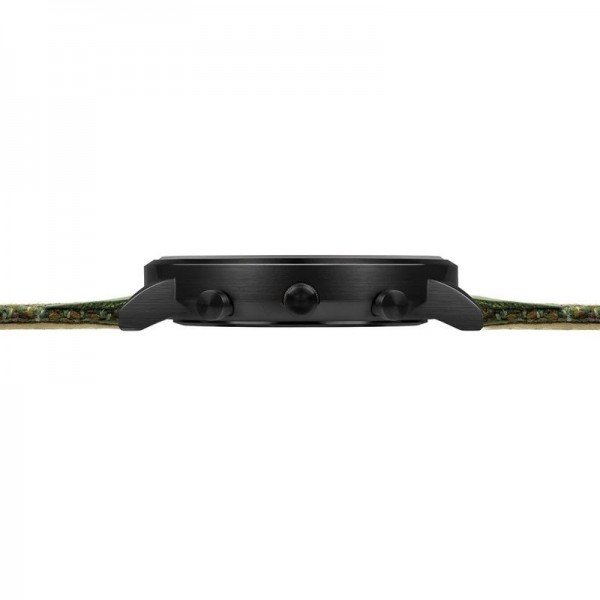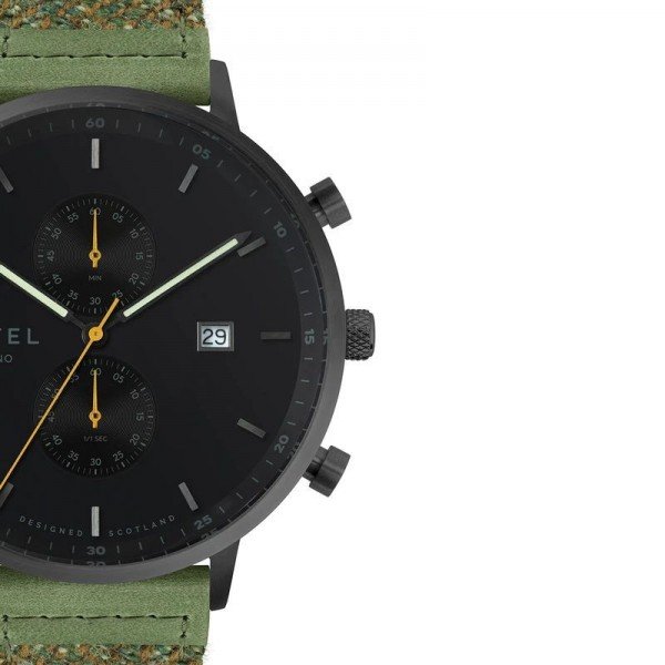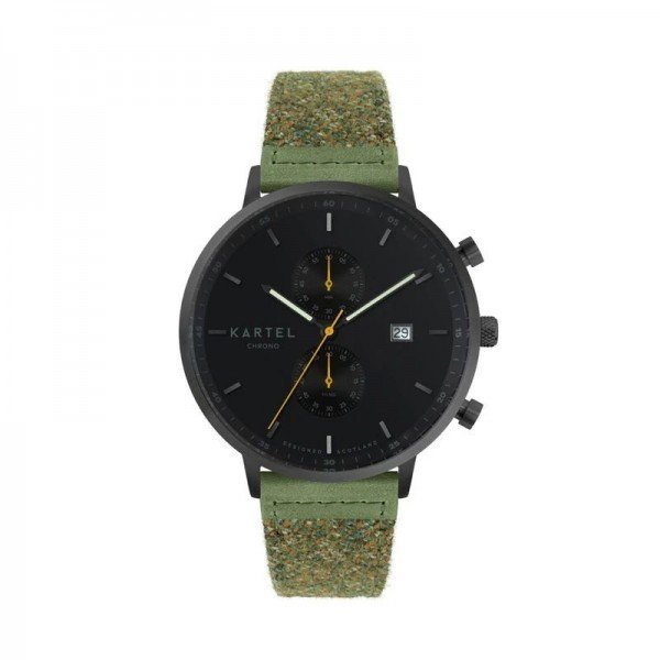This model features our best-selling all-black colour scheme with a black case and dial featuring luminous hour and minute hands and an orange second hand, on a green tweed strap. The dial features dual sub-dials, displaying seconds and minutes with contrasting orange hands, and a simple date window showing the date.