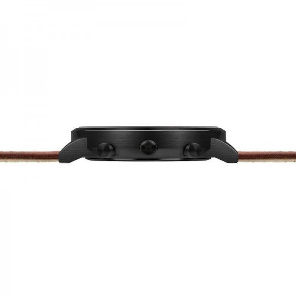 This model features our best-selling all-black colour scheme with a black case and dial featuring luminous hour and minute hands and an orange second hand, on a maroon stitched leather strap. The dial features dual sub-dials, displaying seconds and minutes with contrasting orange hands, and a simple date window showing the date.