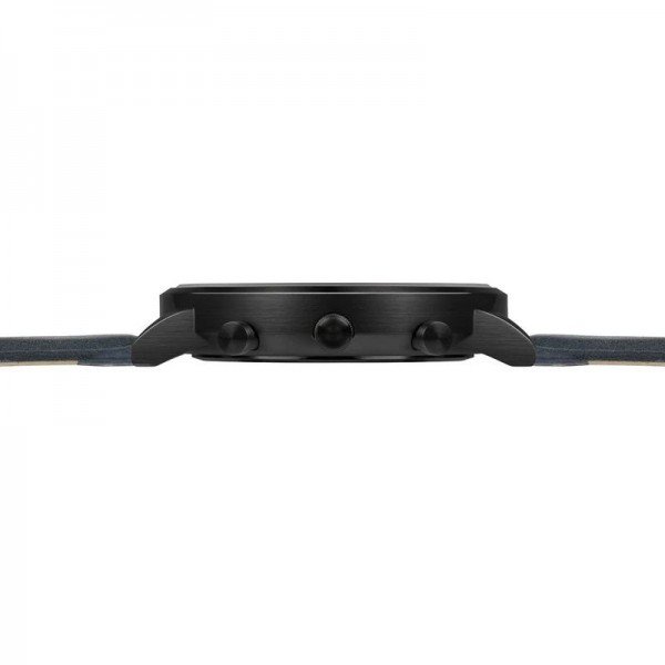 This model features our best-selling all-black colour scheme with a black case and dial featuring luminous hour and minute hands and an orange second hand, on a navy blue stitched leather strap. The dial features dual sub-dials, displaying seconds and minutes with contrasting orange hands, and a simple date window showing the date.