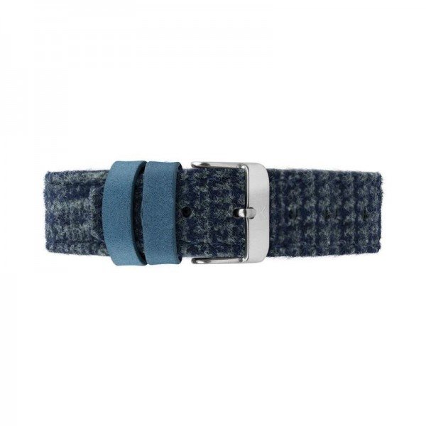 This model uses a stainless steel case with white dial on a blue check pattern merino strap. The date window shows the day of the week and date.