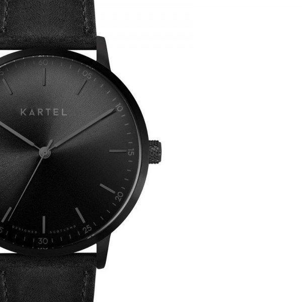 The dial design features a Kartel logo, simple hour markers and discreet numerals in 5 minute increments.