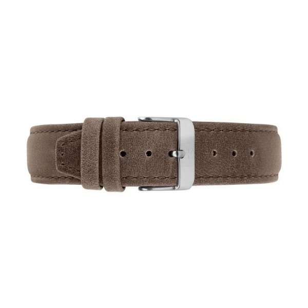 This model uses a stainless steel case with white dial on a brown stitched leather strap. The date window shows the day of the week and date.