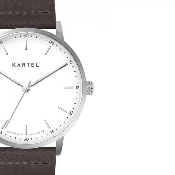 This KT-HUME 40mm-SWDKB model watch features a classic combination of 40mm silver case with white dial on a 20mm width dark brown strap.