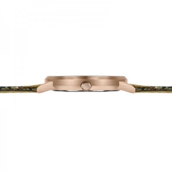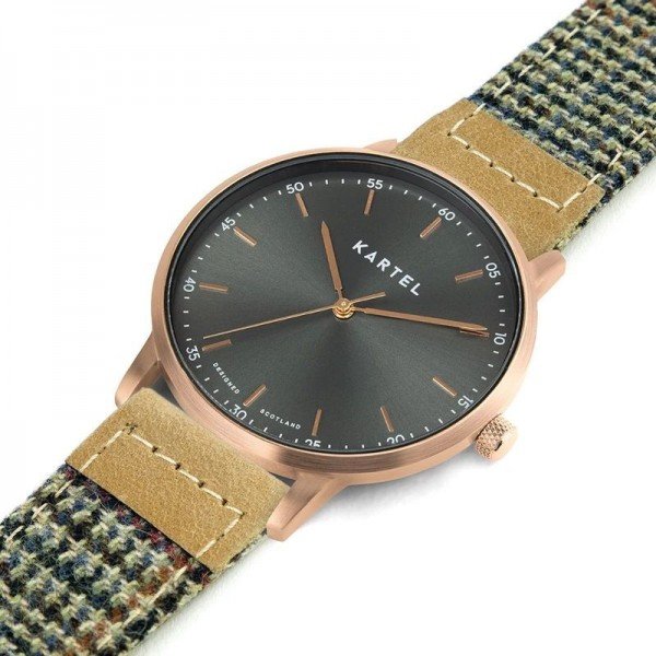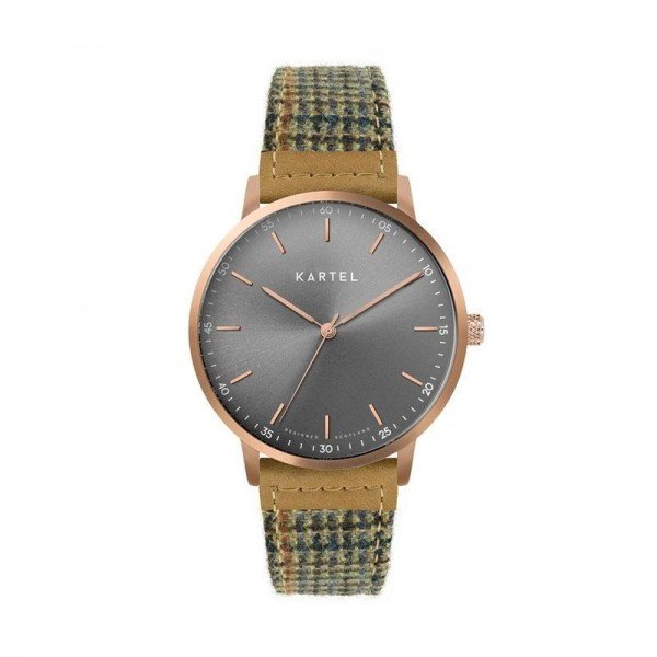 This KT-HUME 40mm-RGTR model features a rose gold tone 40mm case with grey sunray dial on a brown tweed style cashmere strap with tan leather end detail.