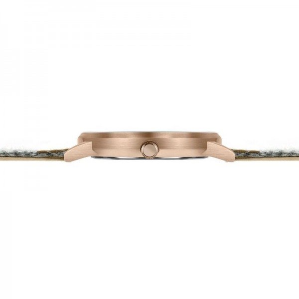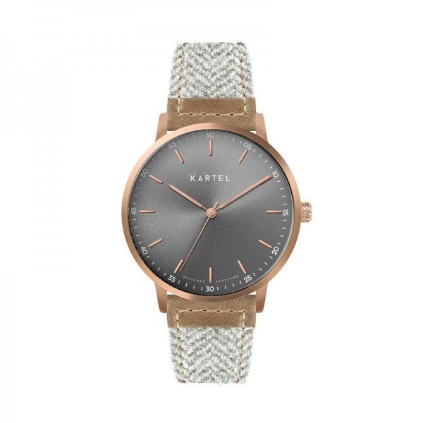 This KT-HUME 40mm-RGY model features a rose gold tone 40mm case with grey sunray dial on a pale grey herringbone pattern lambswool strap.