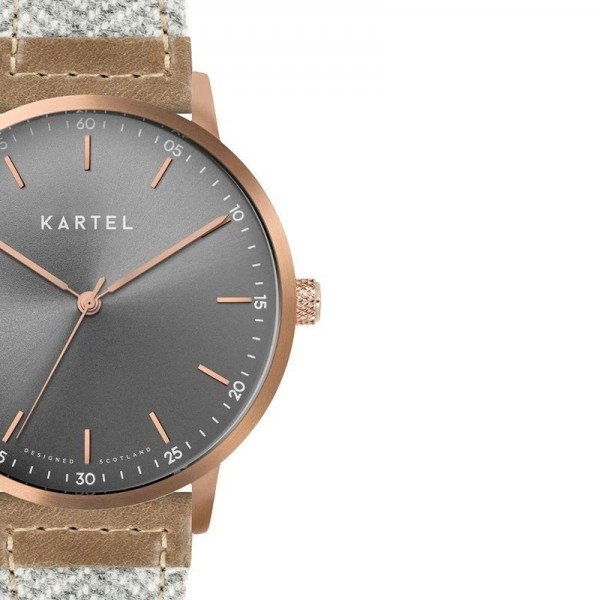 The dial design features a Kartel logo, simple hour markers and discreet numerals in 5 minute increments.