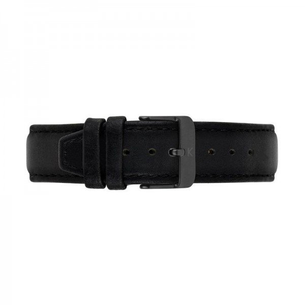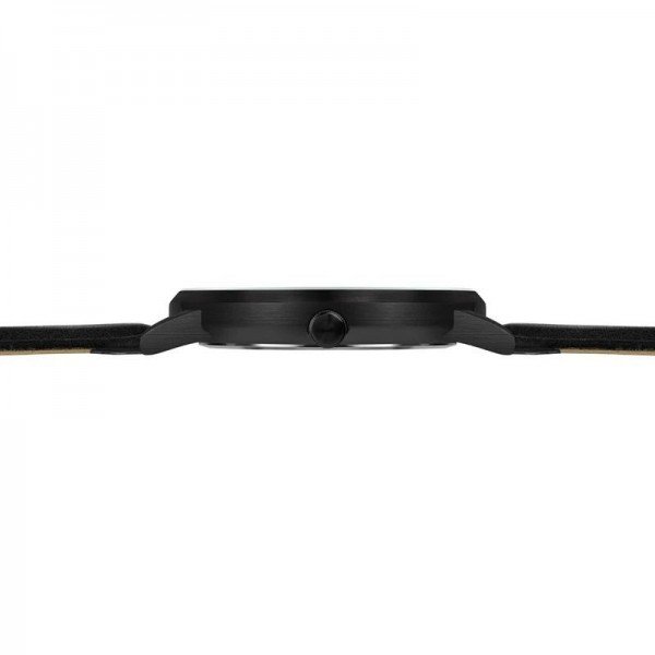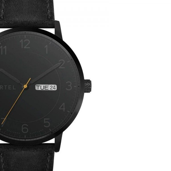 This model uses our best-selling all black colour scheme, with an orange second hand, on a 20mm width stitched black leather strap. The date window shows the day of the week and date.