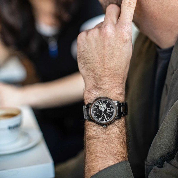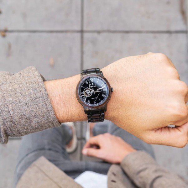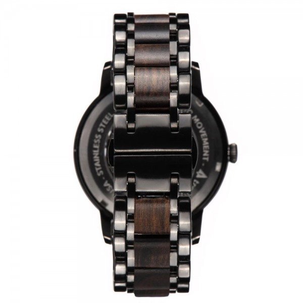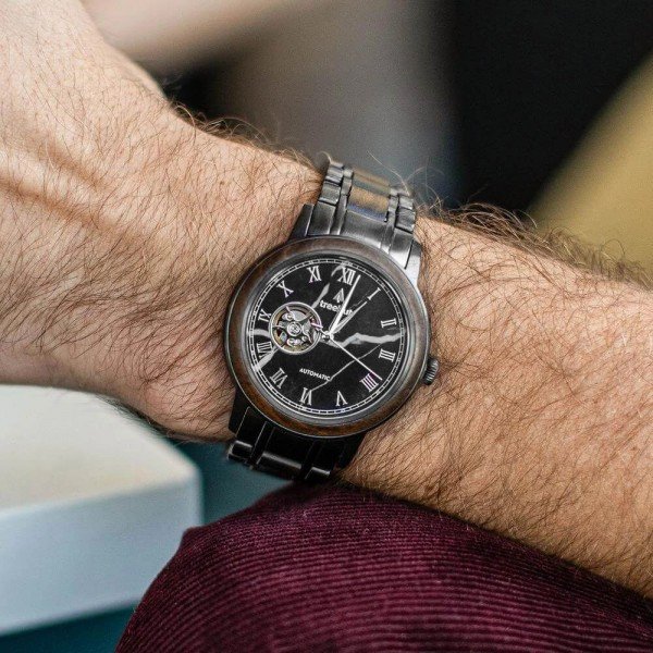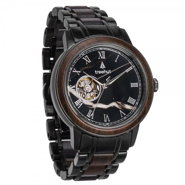 The Atlas Ebony Black Marble automatic men's watch features a black marble dial with a glass opening revealing the movement of the watch detailed with silver roman numerals and silver lance type hands. The case is constructed with an ebony wood bezel and accented with a five-link band made of black stainless steel and ebony wood.